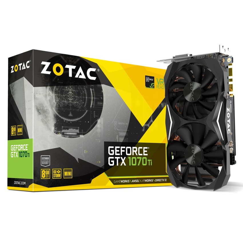 Descripción Zotac GeForce GTX 1070 Ti Mini. Familia de procesadores de gráficos: NVIDIA, Procesador gráfico: GeForce GTX 1070, Frecuencia del procesador: 1607 MHz. Gráficos discretos memoria del adaptador: 8 GB, Tipo de memoria de adaptador gráfico: GDDR5, Ancho de datos: 256 bit. Versión DirectX: 12.0, Versión OpenGL: 4.5. Tipo de interfaz: PCI Express x16 3.0. Tipo de enfriamiento: Activo, Número de ventiladores: 2 Ventilador(es)