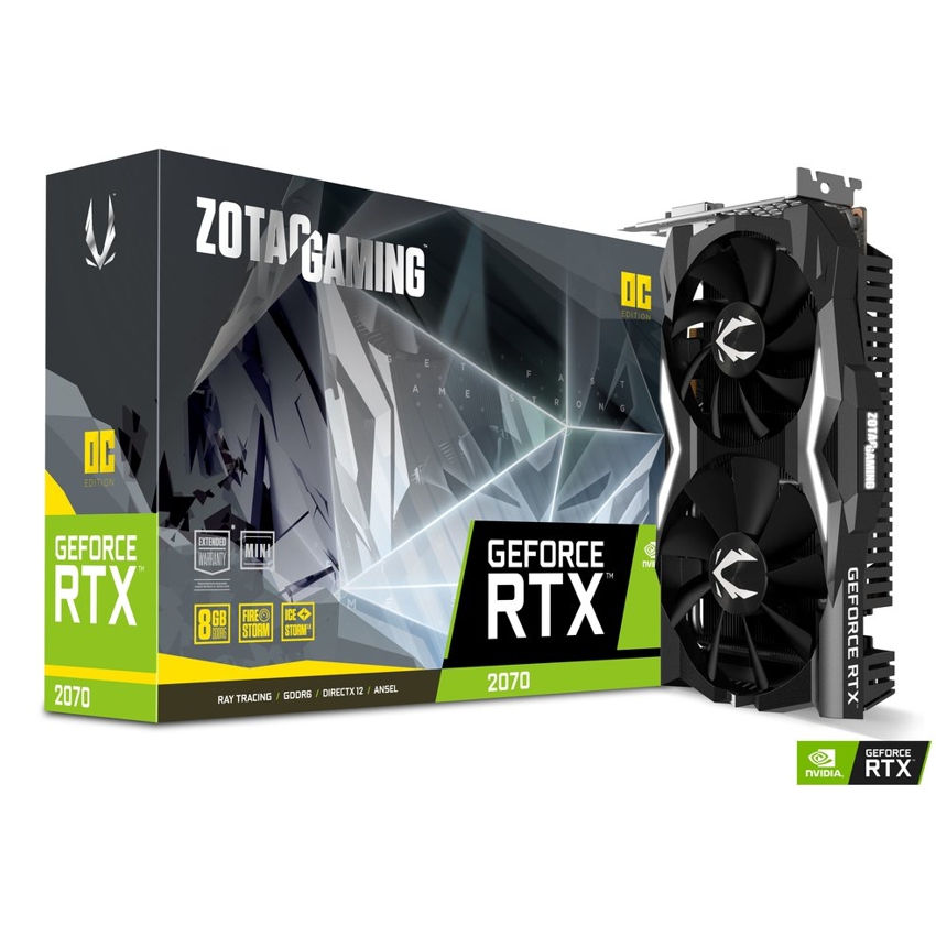 Descripción Zotac ZT-T20700F-10P. Familia de procesadores de gráficos: NVIDIA, Procesador gráfico: GeForce RTX 2070. Capacidad memoria de adaptador gráfico: 8 GB, Tipo de memoria de adaptador gráfico: GDDR6, Ancho de datos: 256 bit. Máxima resolución: 4096 x 2160 Pixeles. Versión DirectX: 12.0, Versión OpenGL: 4.5, Dual Link DVI. Tipo de interfaz: PCI Express x16 3.0. Tipo de enfriamiento: Activo, Número de ventiladores: 2 Ventilador(es)