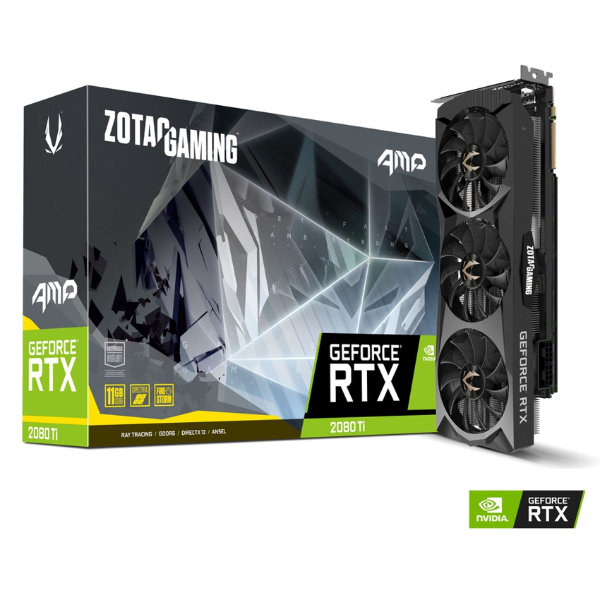 Descripción Zotac GeForce RTX 2080 Ti AMP. Familia de procesadores de gráficos: NVIDIA, Procesador gráfico: GeForce RTX 2080 Ti. Capacidad memoria de adaptador gráfico: 11 GB, Tipo de memoria de adaptador gráfico: GDDR6, Ancho de datos: 352 bit. Máxima resolución: 4096 x 2180 Pixeles. Versión DirectX: 12.0, Versión OpenGL: 4.5. Tipo de interfaz: PCI Express 3.0. Tipo de enfriamiento: Activo, Número de ventiladores: 3 Ventilador(es)